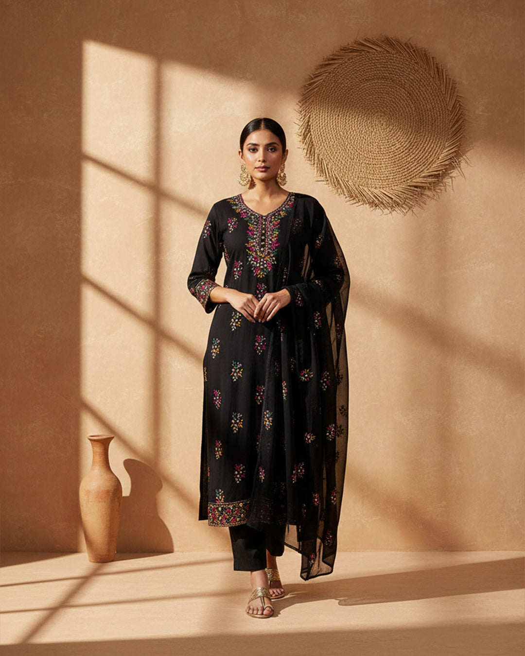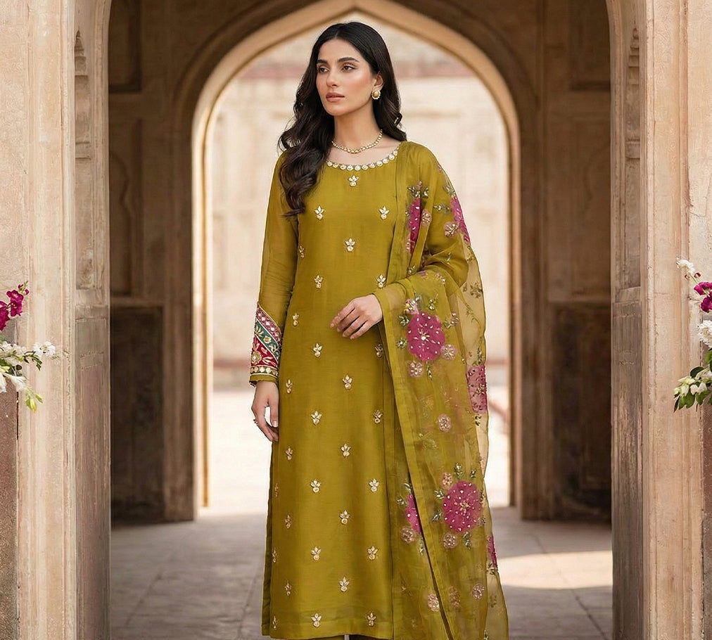 Katan Silk Real Mirror Work Embroidery , 3Pc UnStitched Dress.