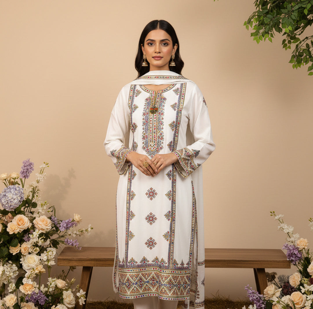 Quickshop Vibrant Floral Elegance — 3-Piece Printed Silk Suit Crafted from premium Shamoz...