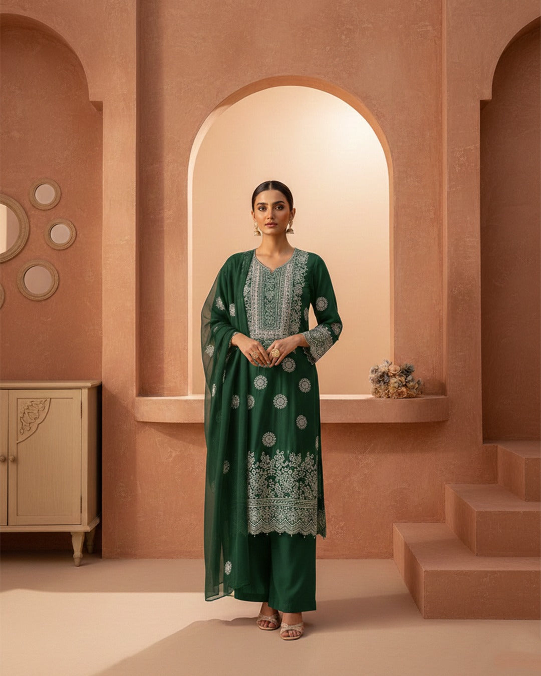 • Mirror Work: Strategically placed mirror accents that add a touch of sparkle and traditional charm.
