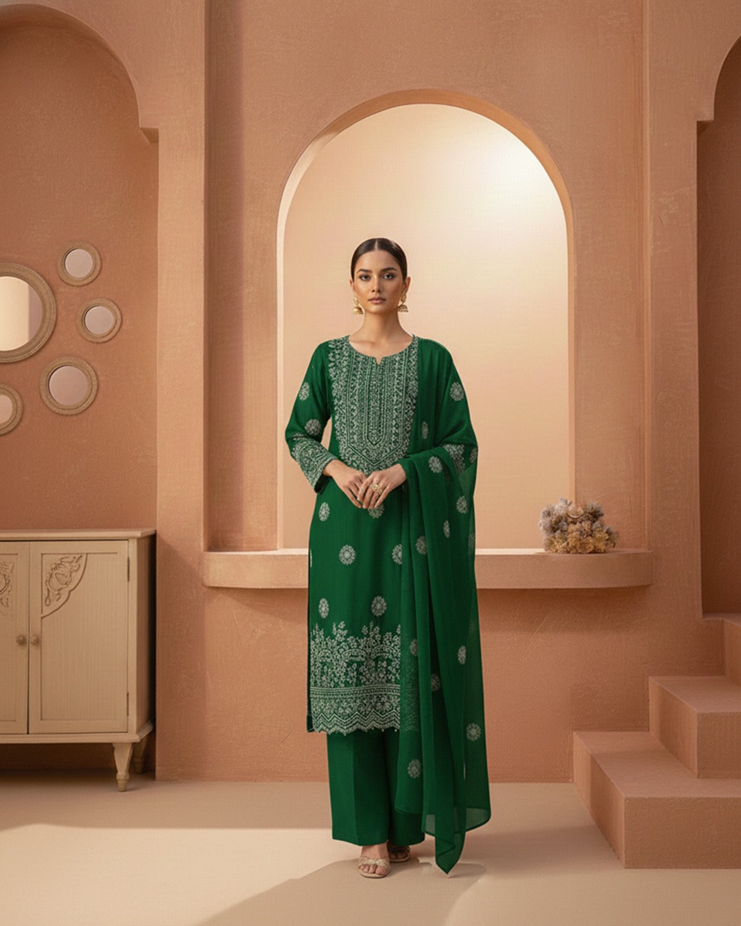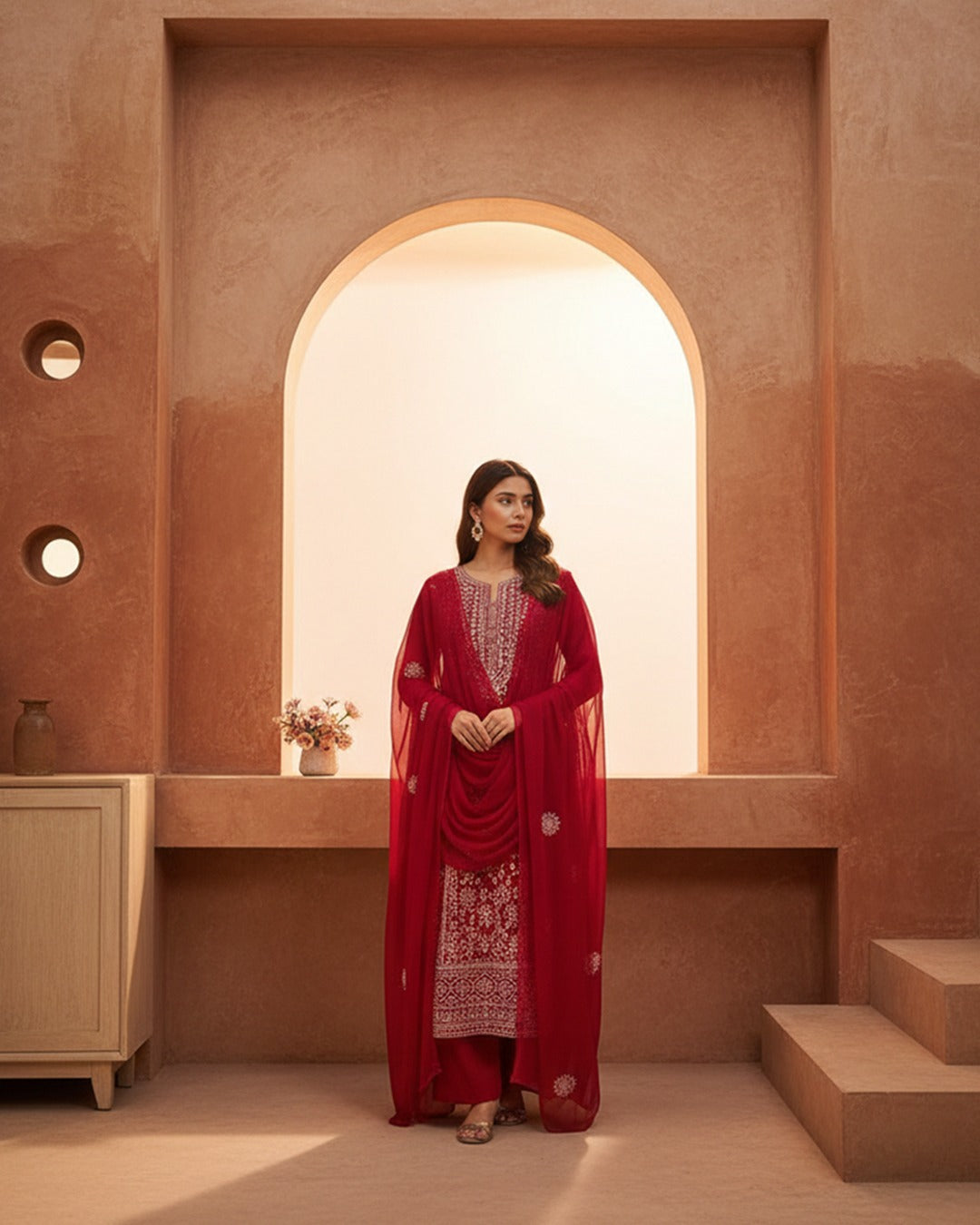 • Shirt (Kameez): * Handmade Shadow Work: Delicate, tonal embroidery that creates a subtle, multidimensional effect across the neckline, bodice, and hem.