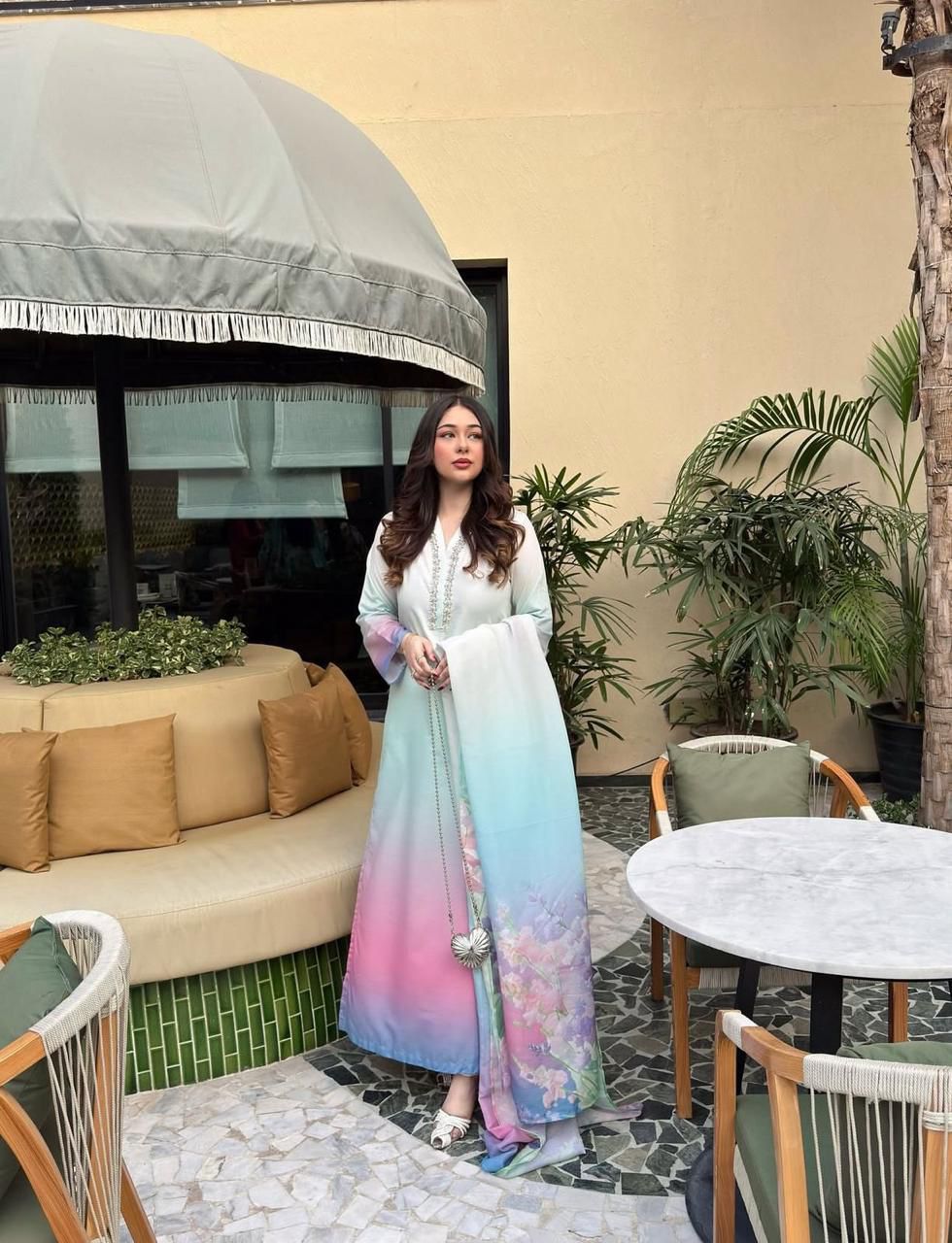Elevate your wardrobe with this sophisticated 3-piece dress crafted from premium Shamoz Silk. Featuring a high-definition digital floral print and delicate embellishments, this outfit is designed for the woman who appreciates refined detail and a radiant finish.