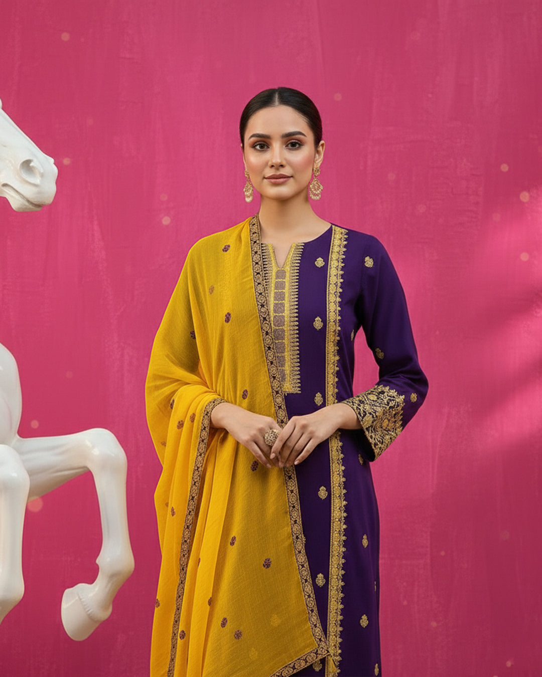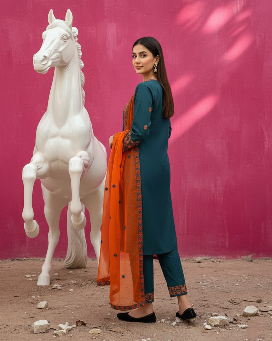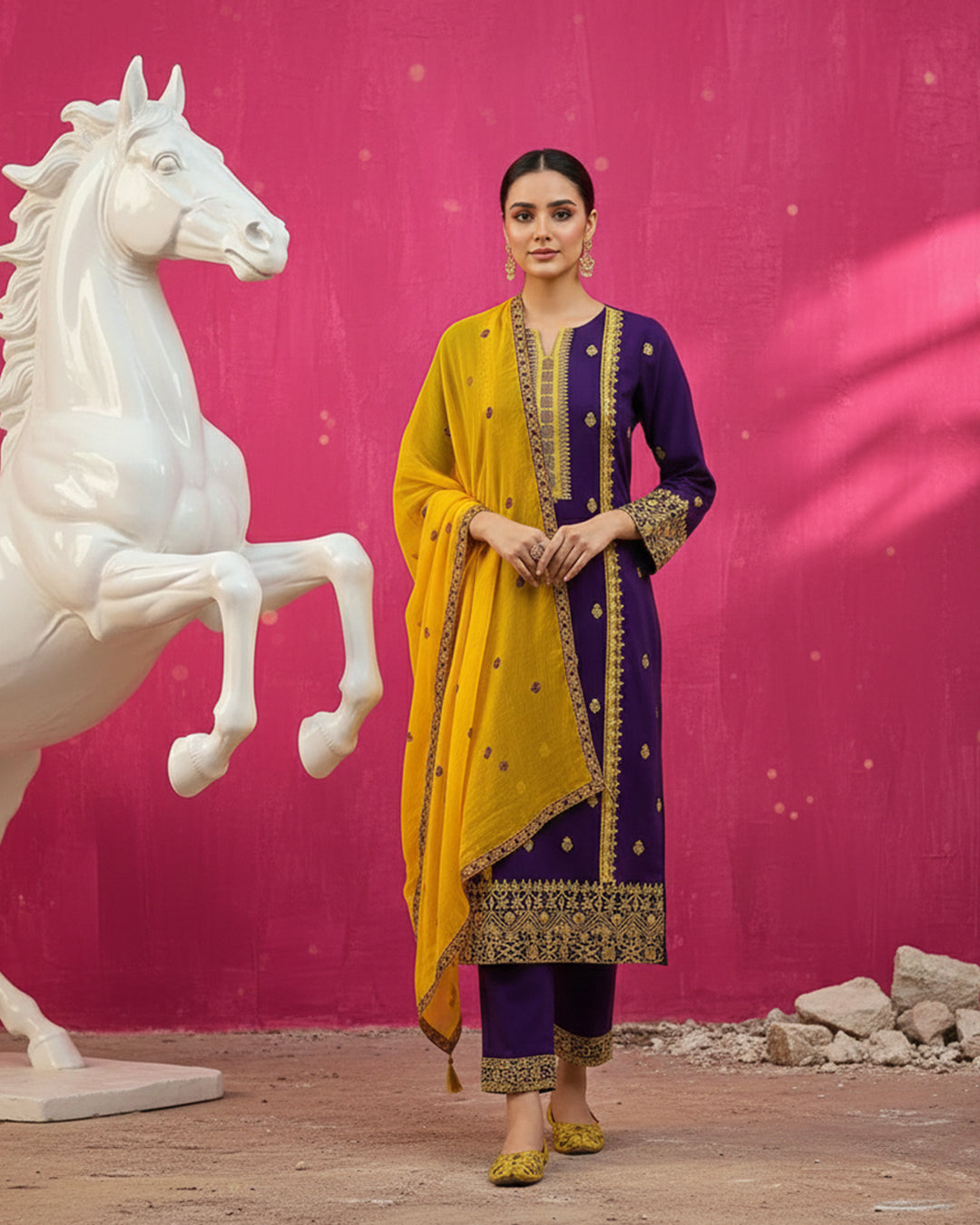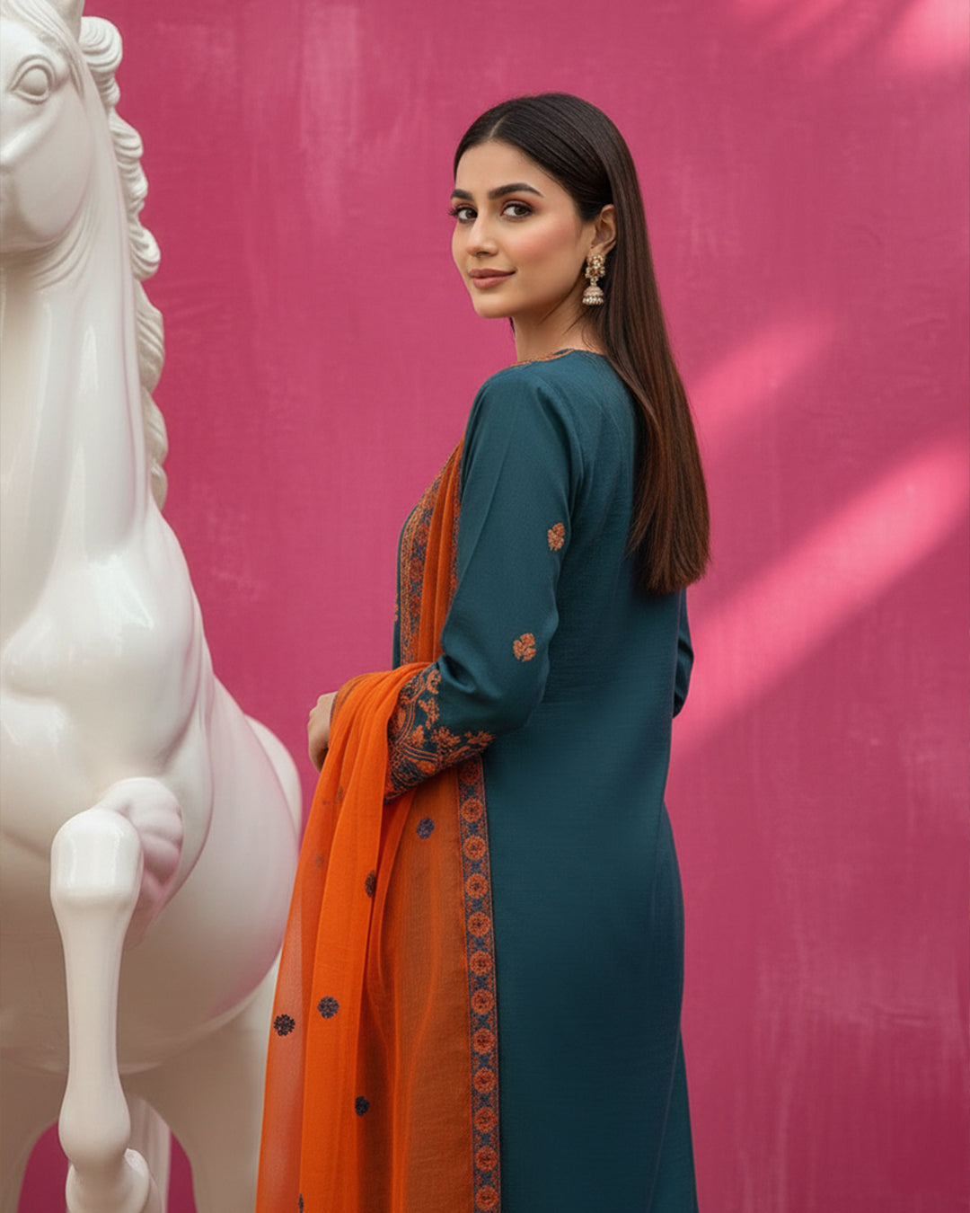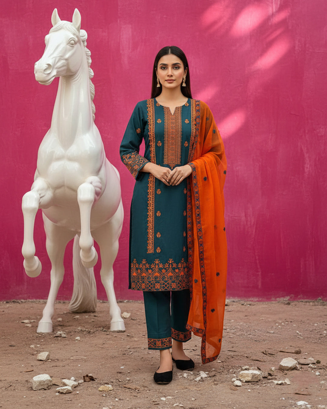 Shirt: Premium Cotton fabric featuring intricate CrossStitch Computer embroidery on the Galla and Daman.