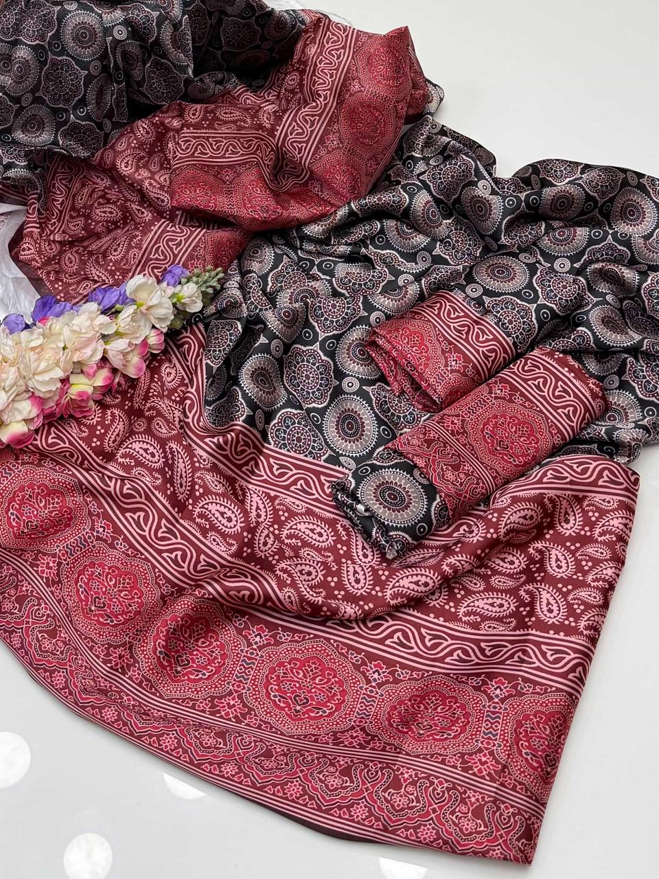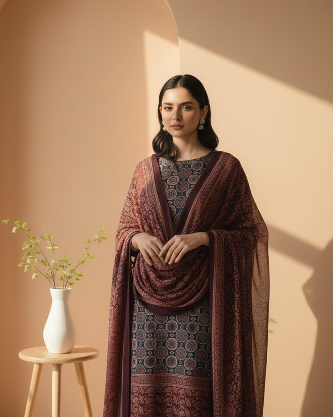 Design: Traditional Ajrak digital print merging cultural richness with modern aesthetics.